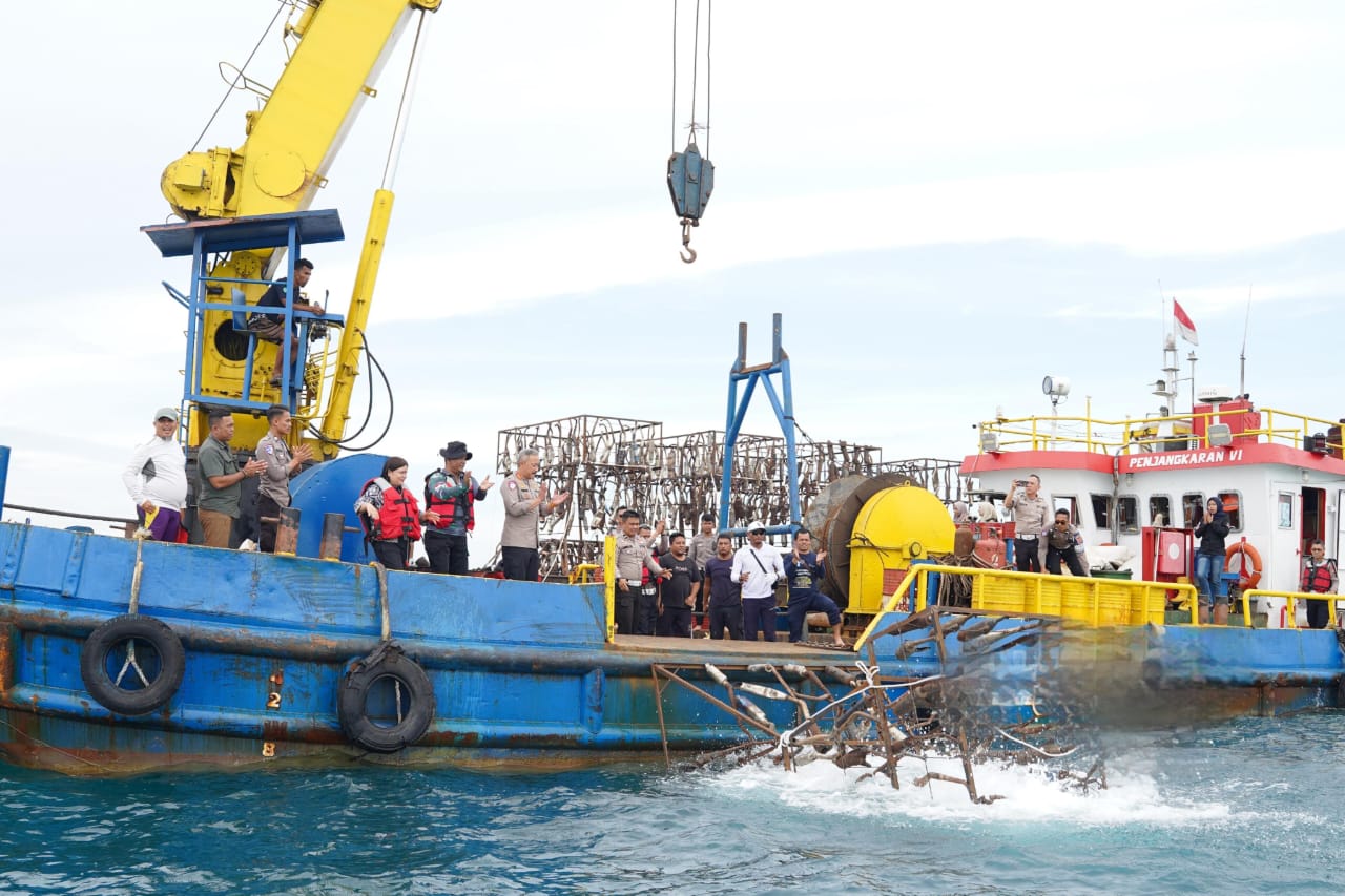 Rumpon itu diturunkan dan dilepaskan ke laut di Perairan Rebo menggunakan kapal crane yang telah disiapkan.